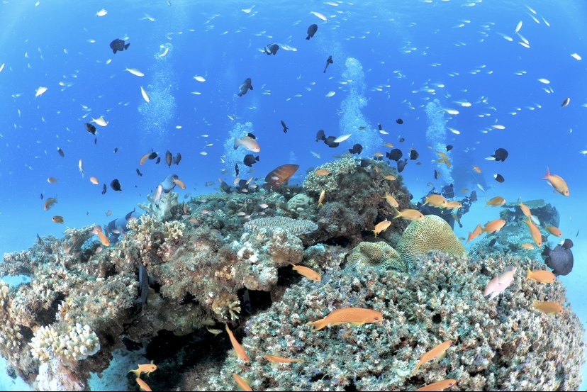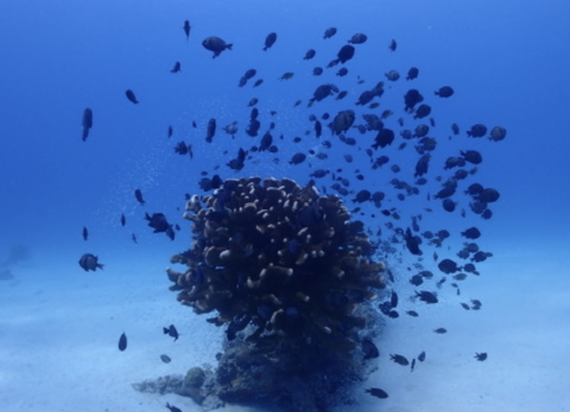 珊瑚の塊に群れるたくさんの魚たち✨